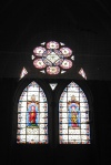 An der Westfassade befindet sich eine monumentale Christusfigur mit Maria Magdalena zu Füßen.