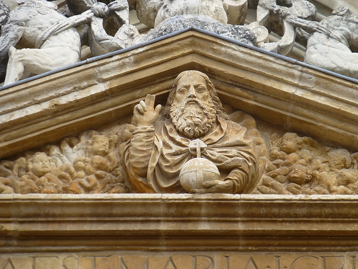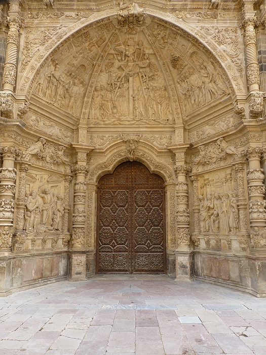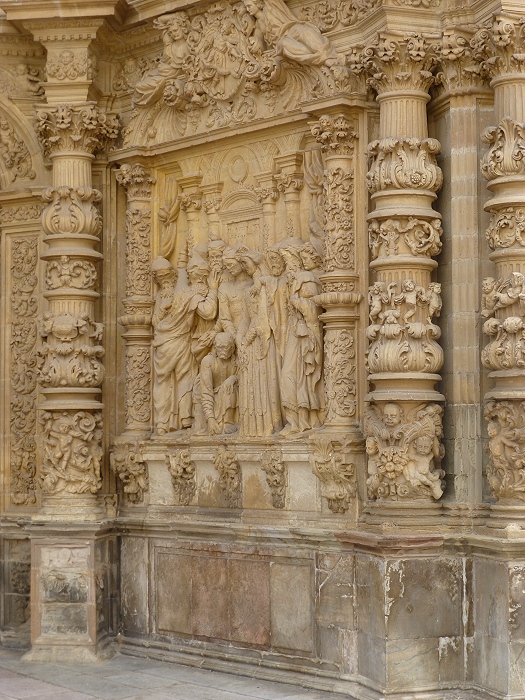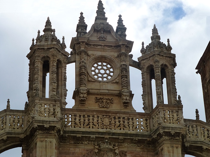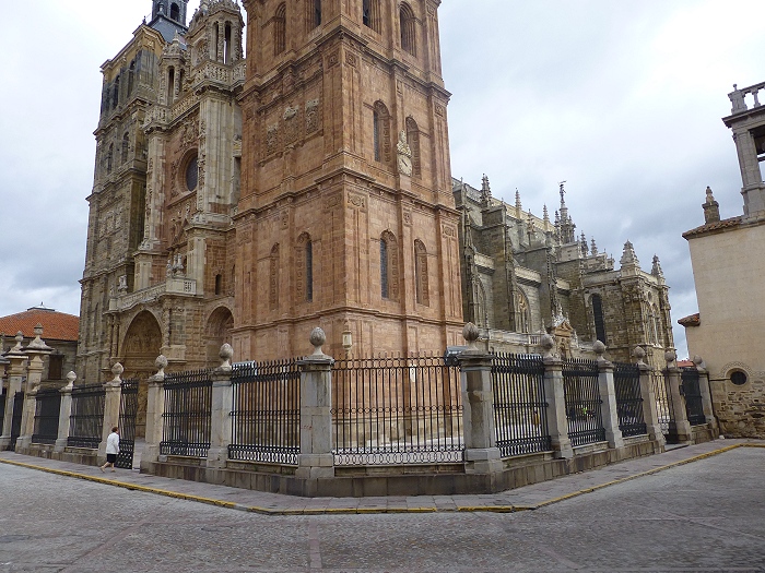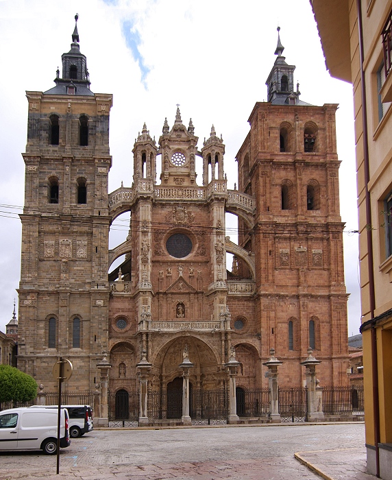 | Die Kathedrale von Astorga entstand zwischen dem 15. und 18. Jh. an der Stelle eines romanischen Vorgängerbaus. Besonders beeindruckend ist die spätgotische Hauptfassade mit ihren Strebebögen. Die Fassade ist von zahlreichen barocken Elementen, pflanzlichen Ornamenten und Figuren geschmückt.