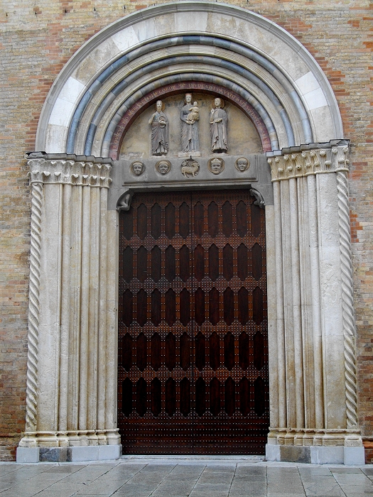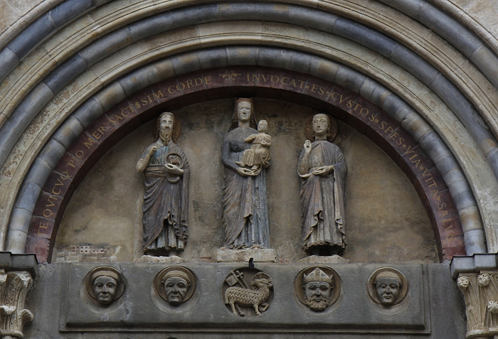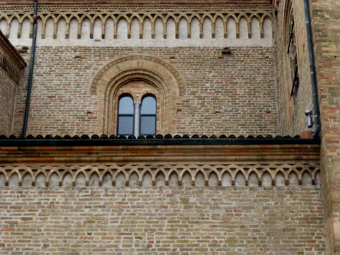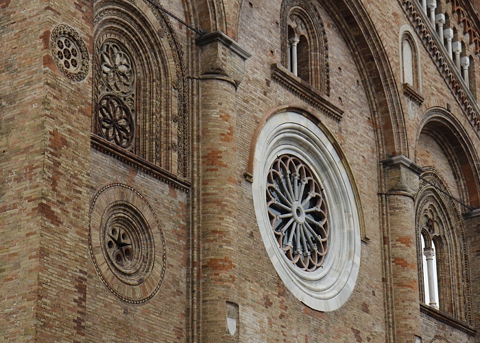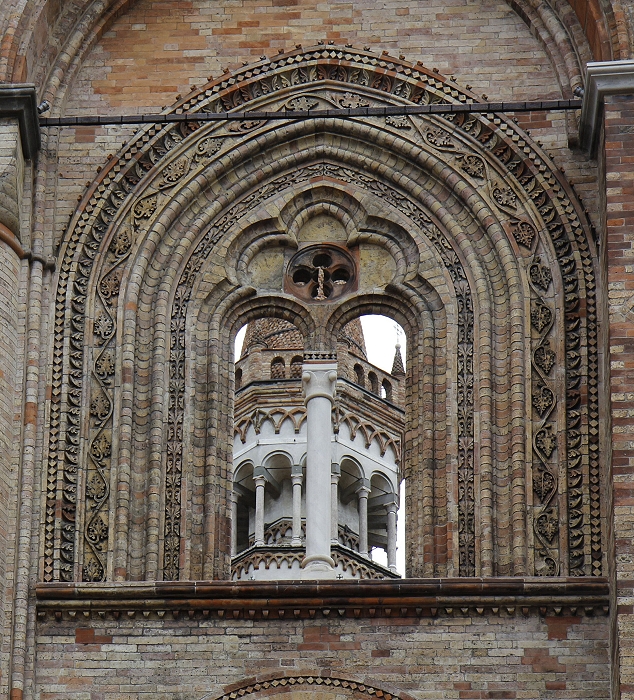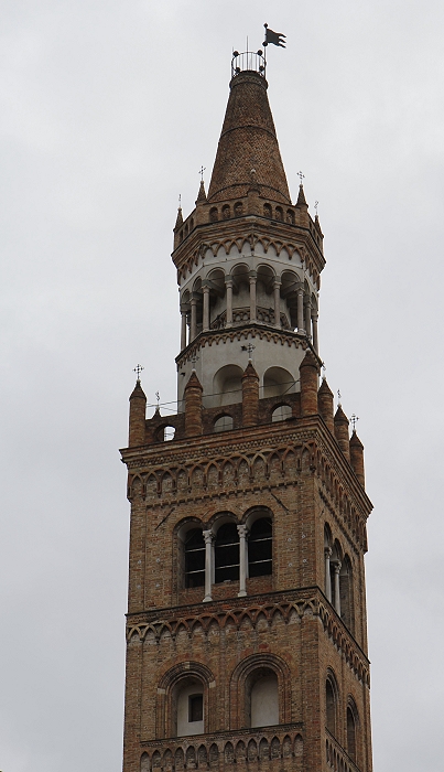 Santa Maria Assunta" von Crema wurde zwischen den Jahren 1284 und 1381 im lombardisch-gotischen Stil errichtetItalien200. Die in drei große Bögen unterteilte Fassade des Domes enthält Zahlenmystik. So ist die dekorative Loggia mit dreiunddreißig Säulen aus Marmor versehen, ein Hinweis auf die 33 Lenbensjahre Jesus. Die gotische Rosette im Zentrum ist sechzehnteilig, ein Hinweis auf die 12 Apostel und 4 Evangelisten. Das Tympanon am Eingang wird durch zwei Atlanten getragen. In der Mitte befindet sich eine Skulptur der Madonna mit dem Jesuskind sowie dem Hl. Johannes dem Täufer und St. Pantaleon. Interessant ist auch das durchbrochene Fenster auf der rechten Seite, durch das man den 58m hohen Glockenturm sehen kann. (Bild 3)