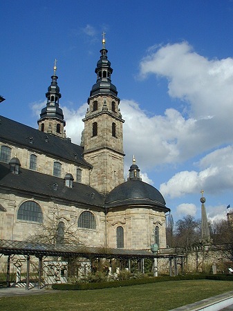 Der Dom zu Fulda wurde unter der Leitung des Stiftsbaumeister Johannes Dientzenhofer 1704-1712 erbaut. An der Stelle des Domes stand ursprünglich die zwischen 791 und 819 errichtete Ratgar-Basilika, die um 1700 abgetragen wurde. Seit der Erhebung Fuldas zum Fürstbistum im Jahre 1752 gilt die ehemalige Stiftskirche als Dom. In der Krypta steht das Grab des hl. Bonifatius, des Apostels der Deutschen. Seit 1867 treffen sich hier die deutschen Bischöfe zur Beratung. Hier ist das Herz des katholischen Deutschlands. Neben dem Dom steht die karolingisch-romanische Michaelskirche
