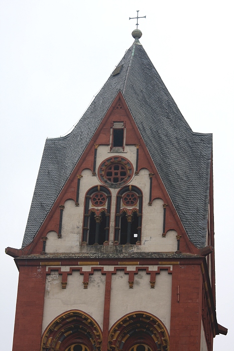 Der spätromanische Limburger Dom mit seinen sieben Türmen und seiner weiß-roten Bemalung wird aufgrund der hohen Lage auf einem Felsen über der Lahn auch "Felsendom" genannt. Der Vierungsturm mißt stolze 66 m Höhe und überragt die anderen Türme. Mit dem Bau der dreischiffigen Basilika wurde am Ende des 12. Jh begonnen. Der Limburger Dom wurde durch den Trierer Erzbischof Theoderich von Wied im Jahre 1235 geweiht. Eine erste Vorgängerkirche ließ Gaugraf Konrad Kurzbold (+948) hier bauen.