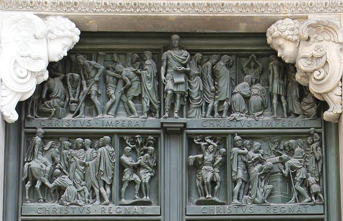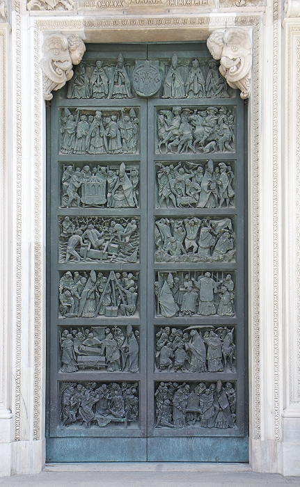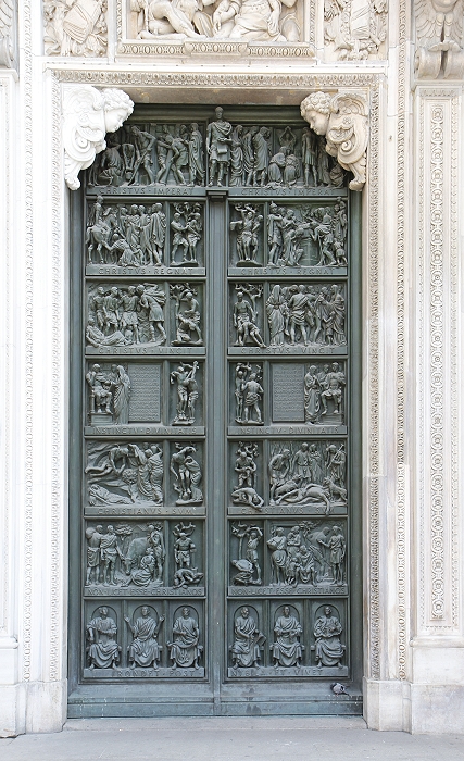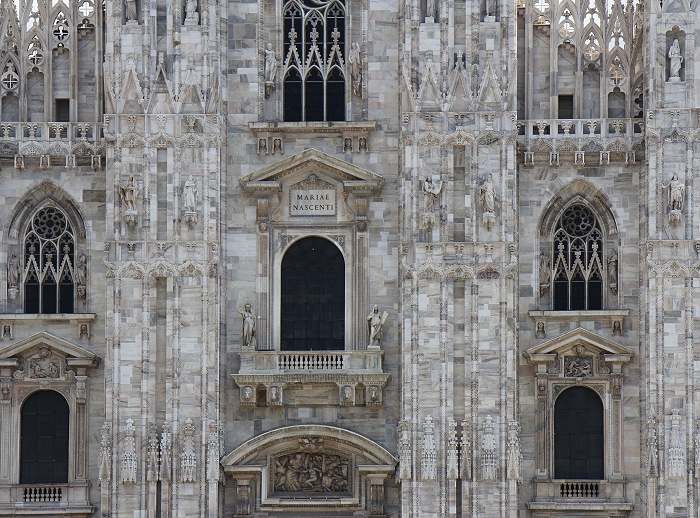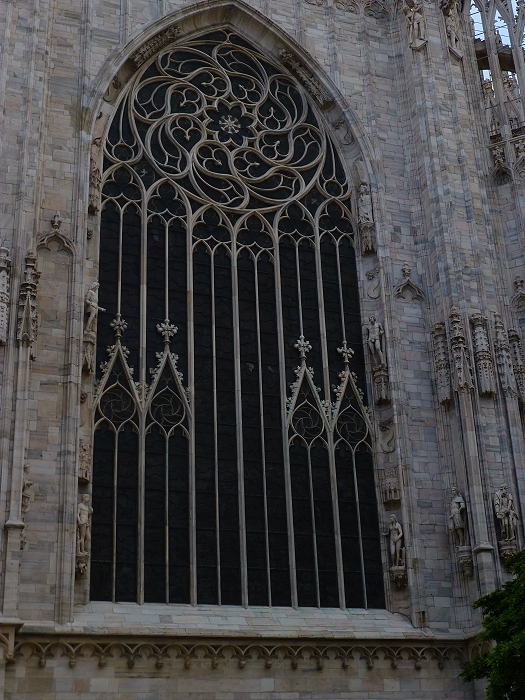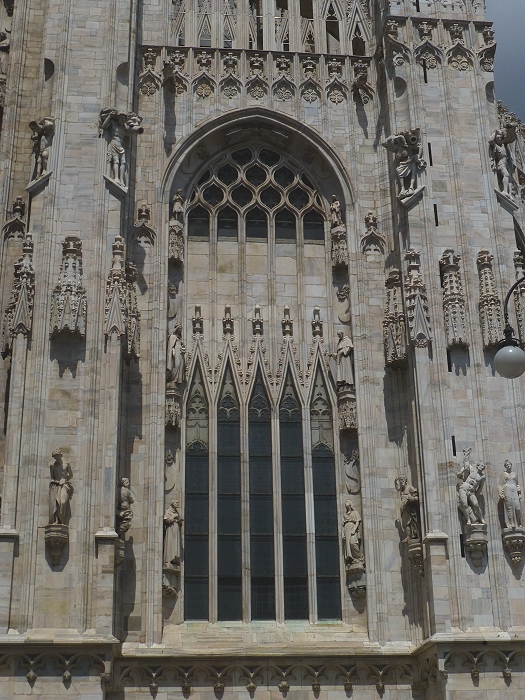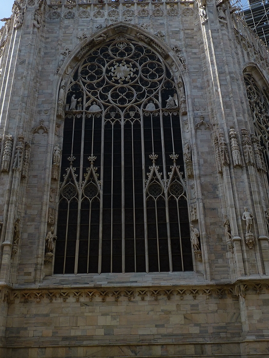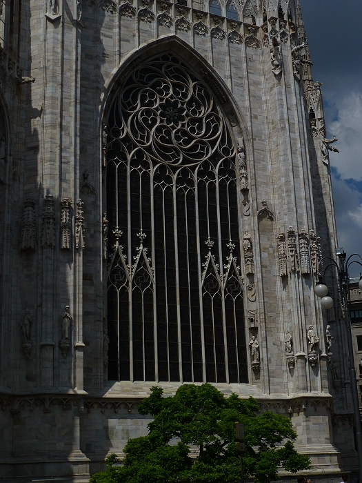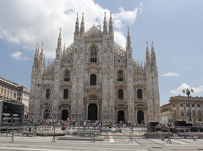 Der Mailänder Dom, Duomo di Santa Maria Nascente (Mariä Geburt) beeindruckt vor allem mit seiner Größe. Das wichtigste spätgotische Bauwerk Italiens ist von der Grundfläche her der drittgrößte Sakralbau, nach dem Petersdom und der Kathedrale von Sevilla. Ursprünglich befanden sich hier zwei Vorgängerbauten, die Kathedrale Santa Maria Maggiore und eine kleinere römische Basilika. Nach einem Einsturz eines Glockenturmes wurde auf Initiative des Mailänder Herzogs Gian Galeazzo Visconti (1341-1402) im Jahre 1386 mit dem Bau der jetzigen Kathedrale begonnen. Der Marmor für den Bau wurde über einen Kanal aus einer Grube am Lago Maggiore beigeschafft. Die Fassade wurde erst ab 1567 errichtet und vereint wegen der langen Bauzeit gotische, klassische und barocke Stile. Am Chor befinden sich hohe gotische Fenster, jedes ein Kunstwerk für sich (Bilder 12-15). Fast 4000 Statuen sind an Fassade und den Türmchen angebracht. Auf der Turmspitze des Vierungsturms befindet sich die größte, etwas über 4m hohe vergoldete Madonnenstatue, die "Madonnina". Das Dach besitzt eine begehbare Terasse, die über Treppen oder Fahrstuhl erreichbar ist. Von dort hat man einen guten Blick über Mailand bis hin zu den Alpen. Auf dem Domplatz befindet sich die Reiterstatue Vittorio Emanuele II. (Bild 1)