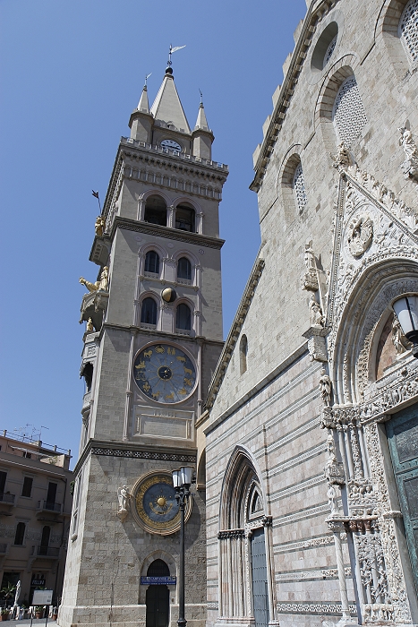 Der Dom von Messina wurde 1197 geweiht, nach mehreren Zerstörungen durch Brände, Erdbeben oder Krieg wurde er immer wieder aufgebaut. Der frei stehende Glockenturm wurde erst 1933 hinzugefügt.