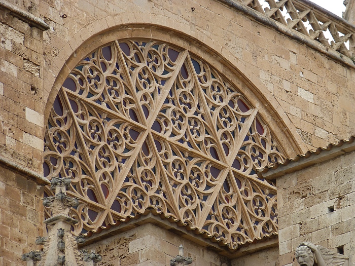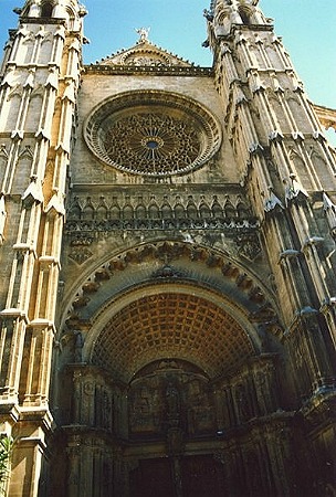 Die Grundsteinlegung der Kathedrale La Seu erfolgte 1230, dem Jahr der Eroberung Mallorcas durch König Aragon. Die hell schimmernde Kathedrale ist das Wahrzeichen der Stadt Palma. Das gotische Bauwerke hat beindruckende Abmessungen: (Innenmaße: 109m Länge, 39m Breite und 43m Höhe). Nach einem Erdbeben 1851 wurde die Kathedrale stark beschädigt. Antoni Gaudi gestaltete ab 1904 den Chor um. Unbedingt sehenswert sind die Fensterrosen an der Ost- (Bild 12) und Westseite (Bild 15) , sowie weitere kleinere Rosetten. Abends wird die Kathedrale angestrahlt, den besten Blick hat man dann vom Meer aus. |