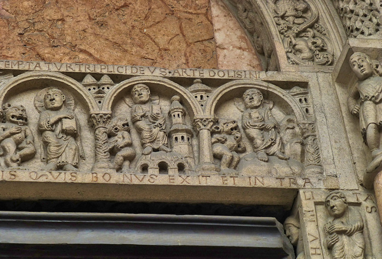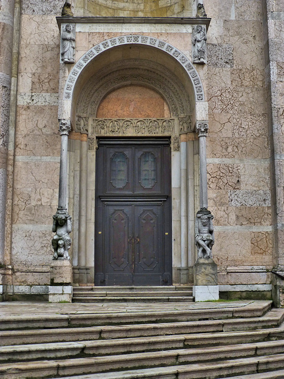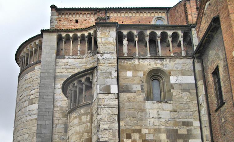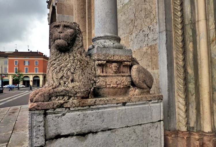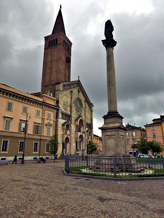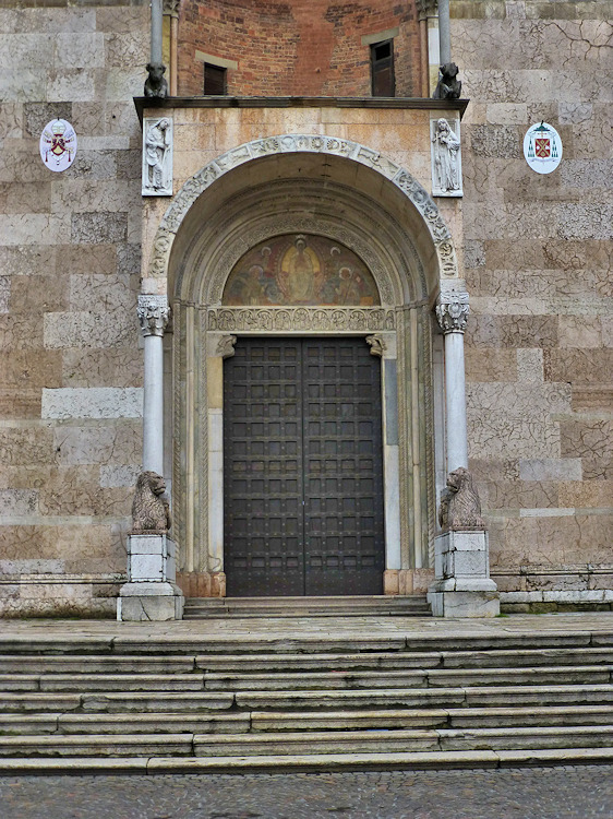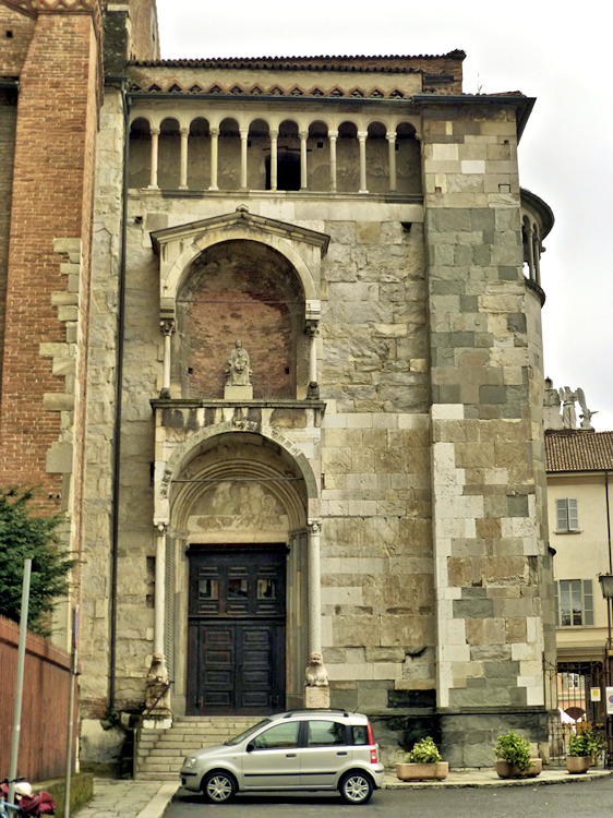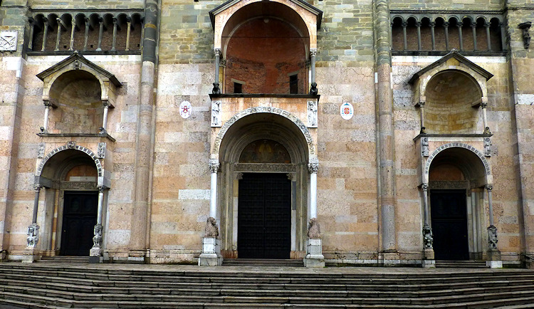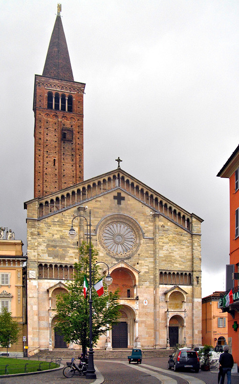 Nach einem großen Erdbeben im Jahre 1117 in der Po-Ebene wurde ein erster Kathedralbau zerstört. 1122 begann der Neubau, der in mehreren Abschnitten erfolgte. Zum lombardisch-romanischen Stil kamen in späteren Jahren gotische Elemente hinzu. Hinter der dreigliedrigen Fassade aus rosafarbigem Veroneser Marmor steht der aus Ziegelsteinen gemauerte 72,5 m hohe Glockenturm aus dem 14. Jh. Auf Befehl von "Ludovico il Moro" wurde im Jahre 1495 am Turm ein Eisenkäfig angebracht. Dieser sollte als Warnung für Kriminelle dienen. (Bild 4) Das Hauptportal und das Seitenportal werden - wie in dieser Region üblich- von Portal-Löwen bewacht. Die Säulen der seitlichen Veranden ruhen auf Trägerfiguren, teils über symbolischen Tieren aus dem 12 Jh. Eine große Fensterrose und üppiger Figurenschmuck zieren die 32m hohe Westfassade, die im oberen Bereich aus Sandstein besteht. Auf dem Vorplatz steht die Gedenksäule für Sabinus von Piacenza (+ 421).