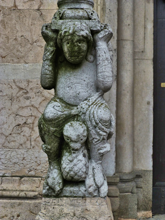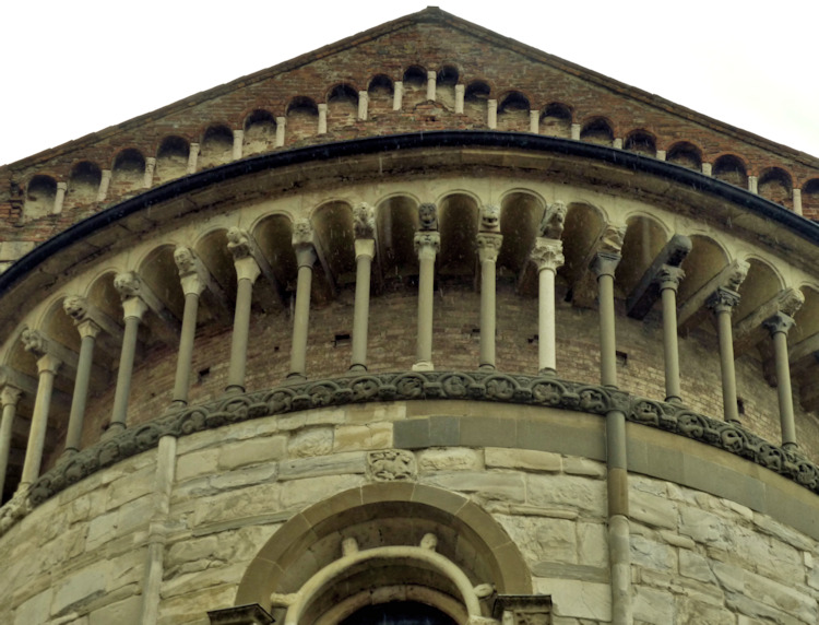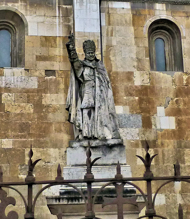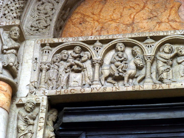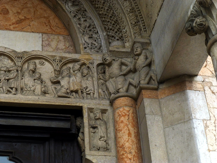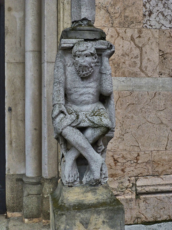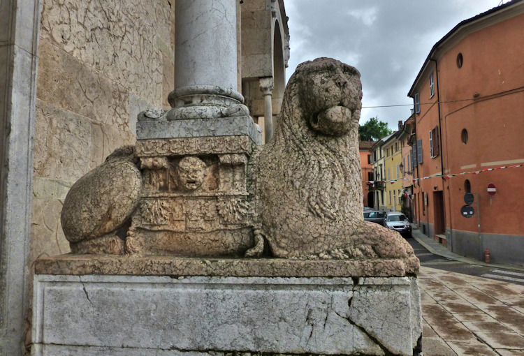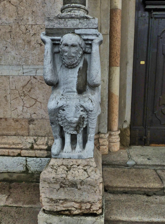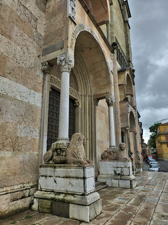 Nach einem großen Erdbeben im Jahre 1117 in der Po-Ebene wurde ein erster Kathedralbau zerstört. 1122 begann der Neubau, der in mehreren Abschnitten erfolgte. Zum lombardisch-romanischen Stil kamen in späteren Jahren gotische Elemente hinzu. Hinter der dreigliedrigen Fassade aus rosafarbigem Veroneser Marmor steht der aus Ziegelsteinen gemauerte 72,5 m hohe Glockenturm aus dem 14. Jh. Auf Befehl von "Ludovico il Moro" wurde im Jahre 1495 am Turm ein Eisenkäfig angebracht. Dieser sollte als Warnung für Kriminelle dienen. (Bild 4) Das Hauptportal und das Seitenportal werden - wie in dieser Region üblich- von Portal-Löwen bewacht. Die Säulen der seitlichen Veranden ruhen auf Trägerfiguren, teils über symbolischen Tieren aus dem 12 Jh. Eine große Fensterrose und üppiger Figurenschmuck zieren die 32m hohe Westfassade, die im oberen Bereich aus Sandstein besteht. Auf dem Vorplatz steht die Gedenksäule für Sabinus von Piacenza (+ 421).