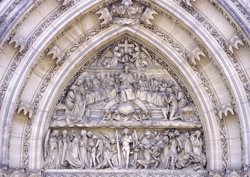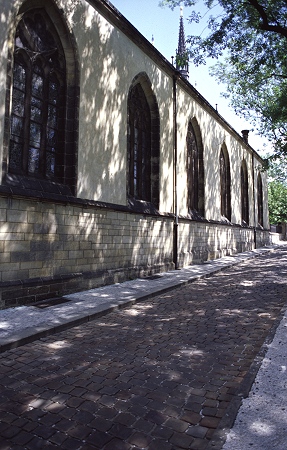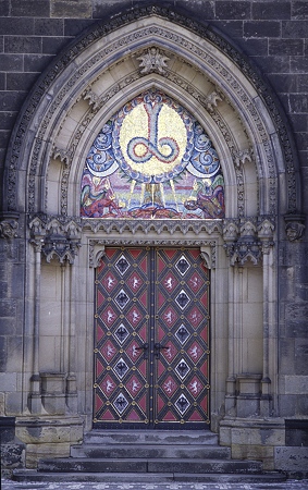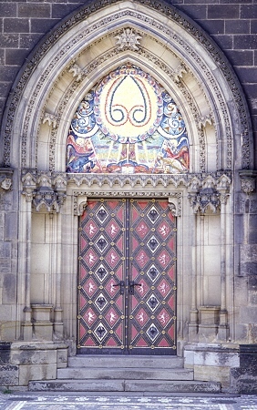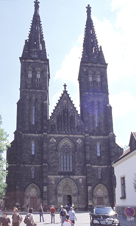 Auf einem Felsen hoch über der Moldau liegt der Vyšehrad. Dort entstand eine befestigte Burgstätte im 10. Jh. Der erste Böhmenkönig aus dem Haus der Premysliden, Vratislav II. (1061 – 1092) wählte den Vyšehrad als seine Residenz. Aus dieser Zeit stammt die noch erhaltene romanische St. Martins-Rotunde und die hier abgebildete St. Peter und Paulus-Kirche. Karl IV. ließ die Kirche gotisieren und im 19 Jh. wurde sie im neugotischen Stil umgebaut. Der angeschlossene Friedhof von Vyšehrad ist seit 1869 Begräbnisstätte bedeutender Persönlichkeiten der tschechischen Nation.