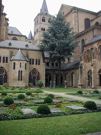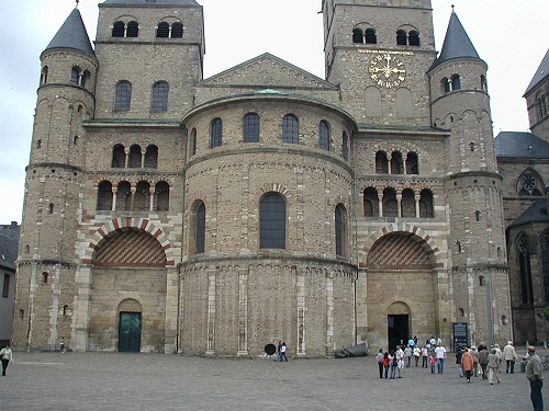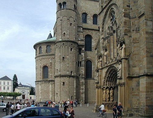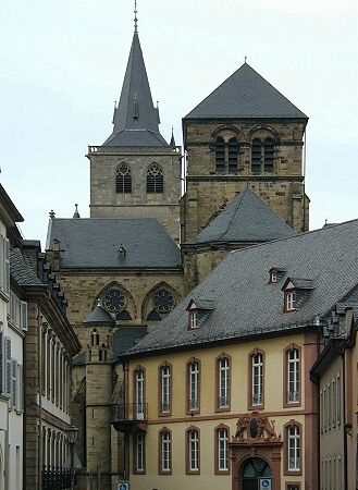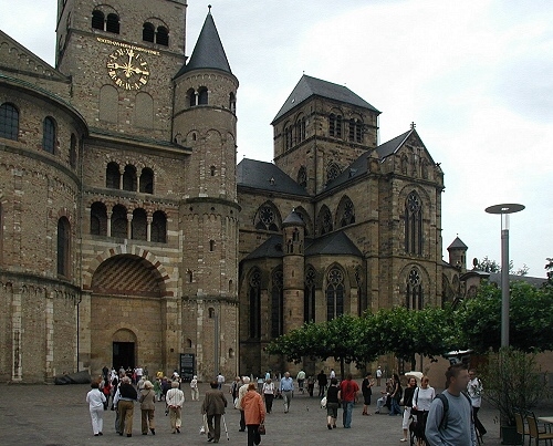 Der Trierer Dom ist somit die älteste Kathedrale nördlich der Alpen. Neben Konstantin dem Großen gilt auch seine Mutter, die Hl. Helena als Mitbegründerin der spätantiken Dopplkirchenanlage. Sie schenkte dem Trierer Bischof Agritius (um 329) ihr Haus, dass dieser zur Bischofskirche umbaute. Die Hl. Helena brachte der Überlieferung nach auch den Heiligen Rock mit nach Trier. Die Reliquie ist seit einer Domrenovierung im Jahre 1974 wieder in einem Schrein ausgestellt und die letzte große Wallfahrt fand 1996 statt. Die heute sichtbare Westfassade mit den romanischen Türmen entstand im 11. Jh.