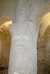 Im Kirchenschiff befinden sich wuchtig wirkende tonnenförmige Rundpfeiler, die den Gesamteindruck prägen.