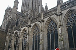 und ihrem wuchtigen Vierungsturm die Silhouette der Stadt Coutances.