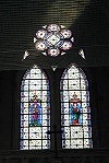 An der Westfassade befindet sich eine monumentale Christusfigur mit Maria Magdalena zu Füßen.