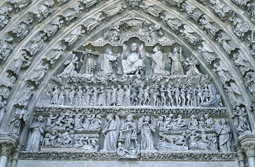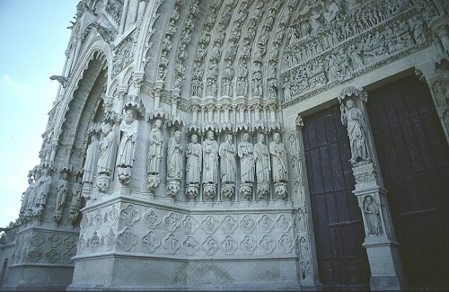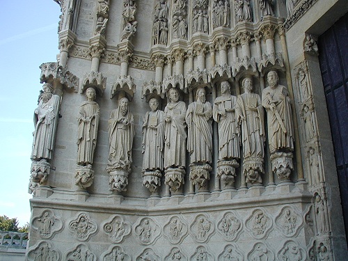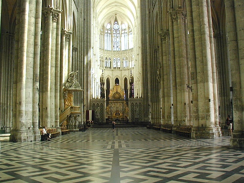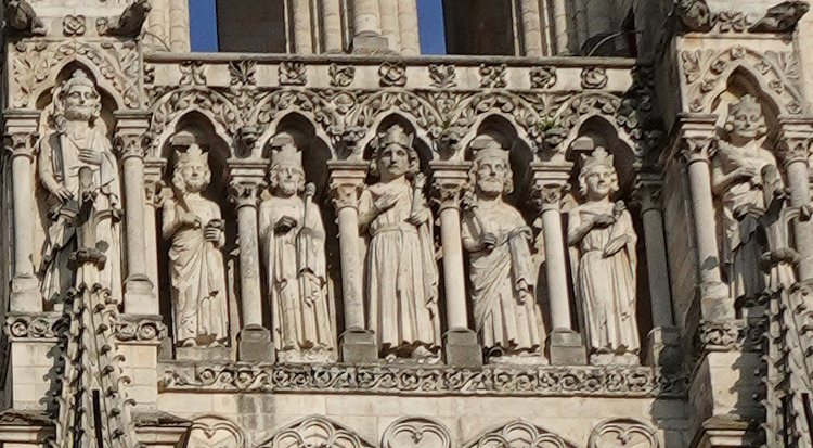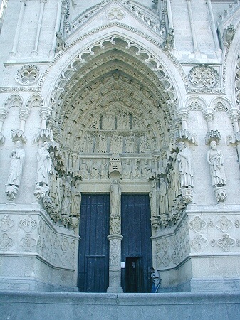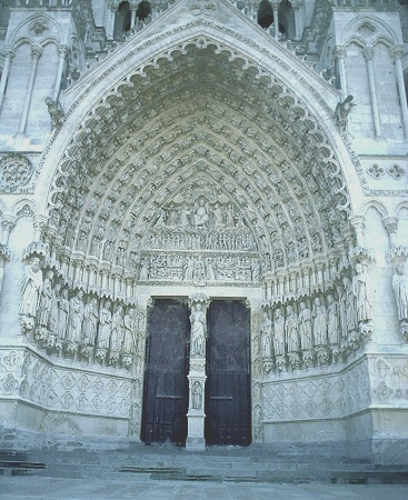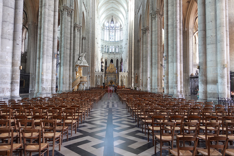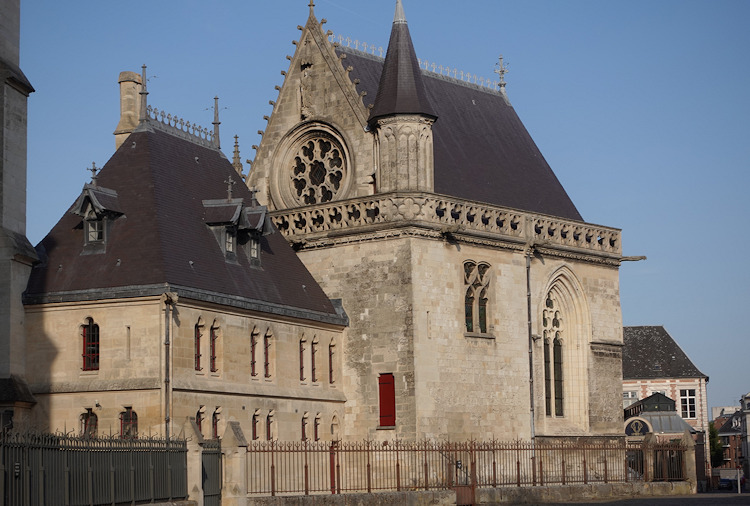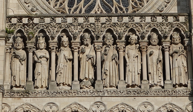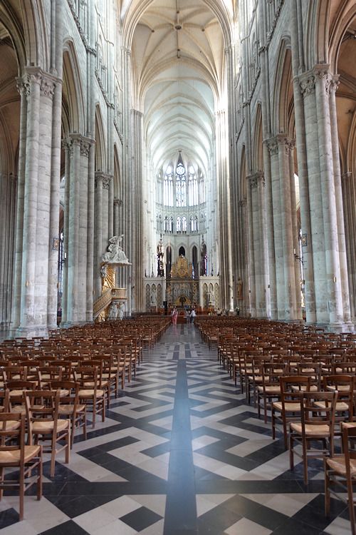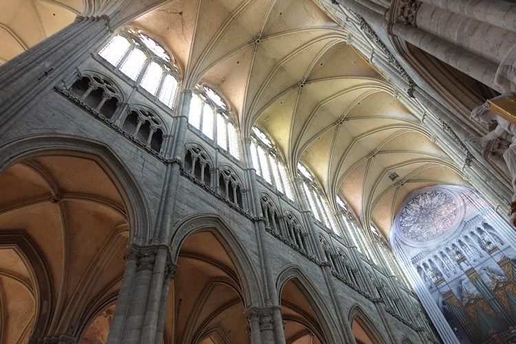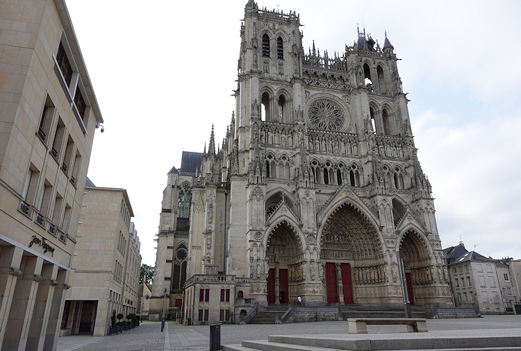 Die größte Kathedrale in Frankreich steht in Amiens. Baumeister der auf den Resten eines Vorgängerbaus erbauten Kathedrale waren Robert de Luzarches, Thomas de Cormont und dessen Sohn Regnaut. Die Grundsteinlegung erfolgte durch Bischof Evrard de Fouilly im Jahre 1220. Das Welterbe der UNESCO ist ein Musterbeispiel der nordfranzösischen Gotik. Für den Kölner Dom war sie das Vorbild. Die Fassade ist stark von Notre-Dame in Paris beinflusst. Der Nordturm misst 66m, der Südturm 65m und der Vierungsturm stolze 112,7 m. Eine Gewölbehöhe von 42,3m und eine innere Länge von 133,5m bieten dem Besucher einen unvergesslichen Eindruck der Klarheit und Größe. Im Langhaus befindet sich im Boden ein Labyrinth aus Fliesen. Im Innern findet man ein bemerkenswertes schönes Chorgestühl aus dem frühen 16 Jh. Über den reich verzierten Portalen der Westfassade befindet sich eine Königsgallerie mit 22 Statuen französischer Könige. (Bilder 37 - 39). Die Westfassade mit ihren unzähligen Figurenskulpturen und den detailreichen Tympana lädt zum Staunen ein. Eine Augenweide sind die unterhalb der Figuren angebrachten Kämpfer, die mit ihrer Last zurechtkommen müssen. Wunderschön sind die drei sich ähnlich sehenden Fensterrosen. Eine Ausführliche Beschreibung zur Kathedrale und ihren Bauteilen finden sich auf der französischen WIKI-Seite zur Kathedrale.