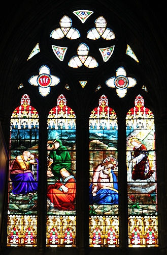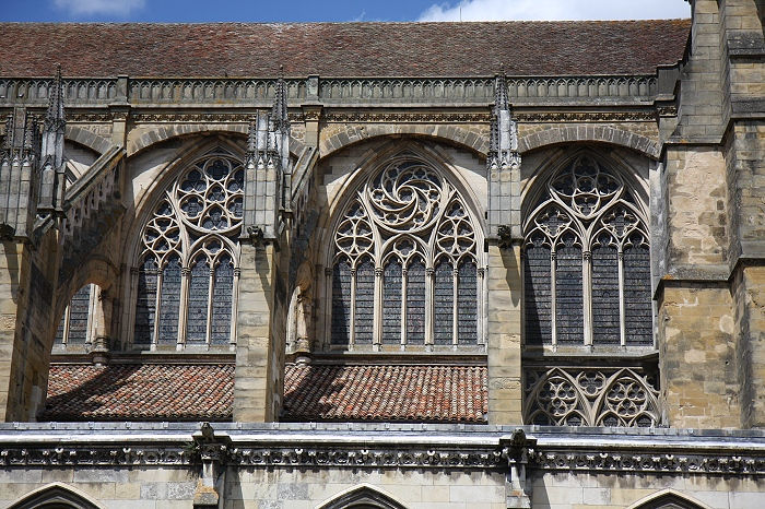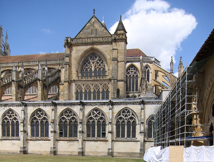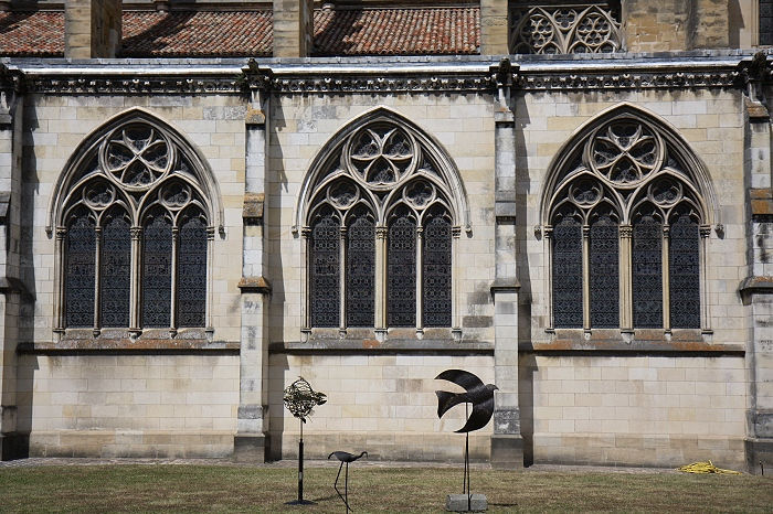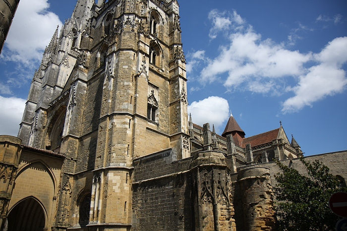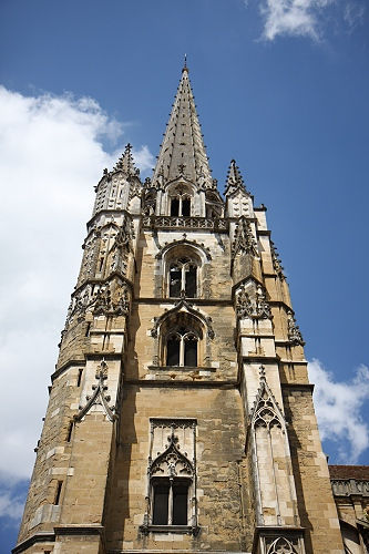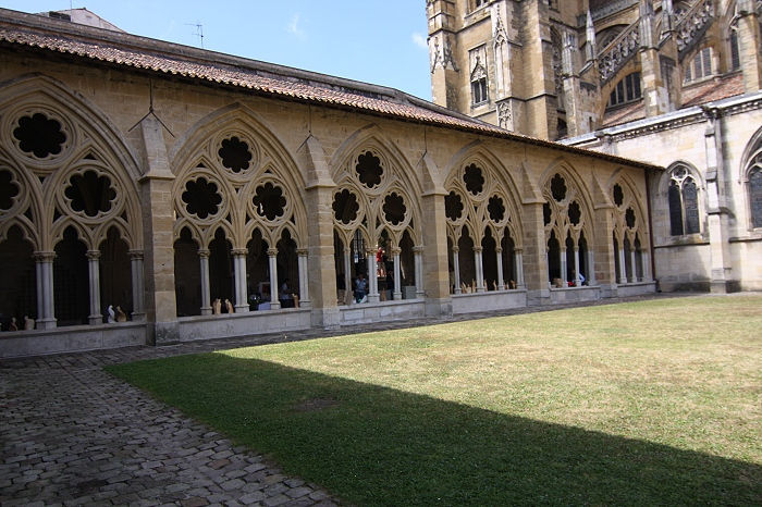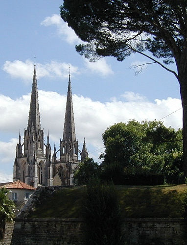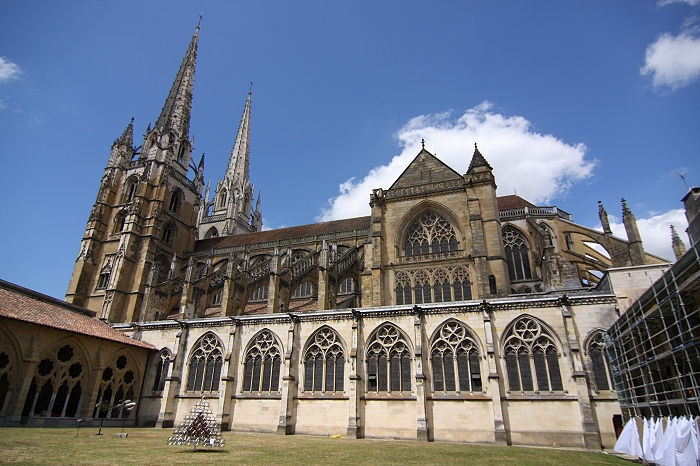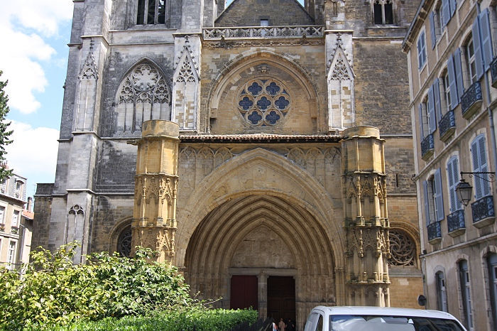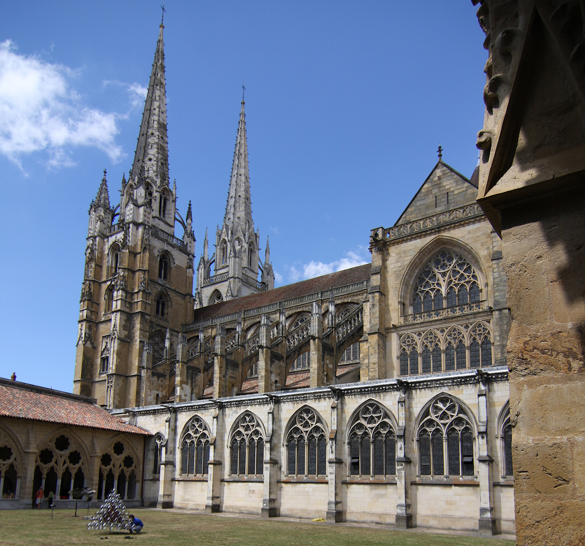 In der historischen Altstadt von Bayonne, auf einer Anhöhe über dem Zusammenfluss von Adour und Nive, steht die Kathedrale Sainte-Marie. Schon aus der Ferne beindruckt sie mit ihrer 80m hohen Doppelturmfassade. Der Mitte des 13. Jh. begonnene gotische Bau zeigt Einfluss aus der Champagne, vor allem an der Apsis und am Chorumgang. Aus dieser Zeit stammt auch der bronzene Türklopfer am Nordportal (Bilder 5+6). Abgerundet wird die Anlage durch einen im 14. Jh. angefügten Kreuzgang. Im 19. Jh. gab es eine größere Restaurierung durch Emile Boeswildwald, einem Schüler von Eugène Viollet-le-Duc.