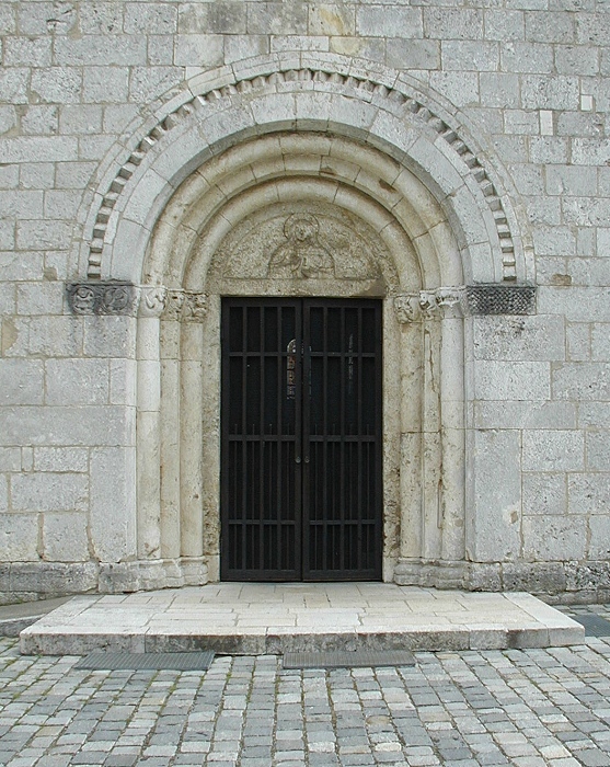 Die Weihe der nach Hirsauer Vorbild erbauten Abteikirche erfolgte 1133. Der erste Abt war Bischof Eberhard. Eberhard stiftete zuvor das Kloster St.Michael in Bamberg, war Prior in Prüfening bei Regensburg und wurde 1147 zum Bischof von Salzburg berufen. Während der Reformationszeit wurde 1589 das Kloster den Jesuiten übergeben. 1783 übernahmen Malteser die Anlage. Heute wird die ehemalige Benektinerabteikirche als Pfarrkirche genutzt. Die 36m hohen Doppeltürme verleihen der dreischiffigen Pfeilerbasilika ein imposantes Erscheinungsbild. Die gediegene Form der Basilika geht auf einen genialen romanischen Bauplan zurück, der geometrische Formen wie etwa das gleichseitige Dreieck berücksichtigt. Am Portal und an der Apsis findet sich noch üppiger romanischer Figurenschmuck. |
