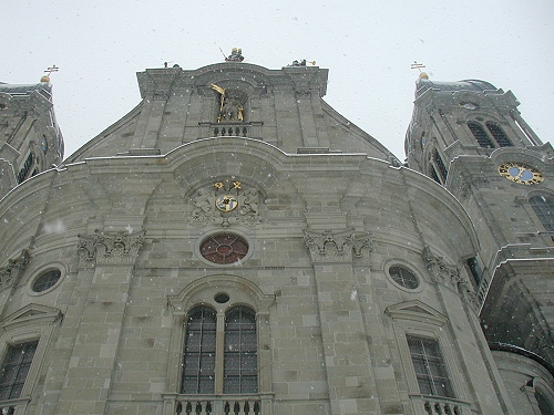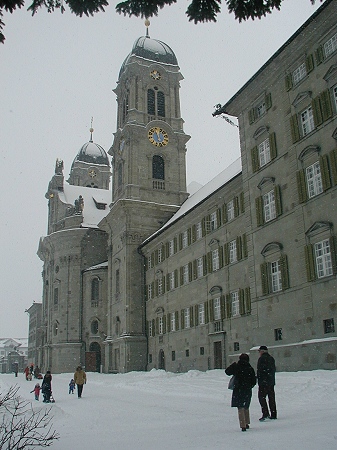 Der Ursprung des Benediktinerklosters Einsiedeln geht auf den Reichenauer Mönch Meinrad um 828 zurück. Eine erste Kirche in Einsiedeln wurde 948 eingeweiht. Die heutige Stiftskirche geht auf einen Neubau aus dem Jahre 1704 zurück. Imposant wirkt die 136m breite Westfassade. Im Innern findet man eine überwiegend barocke Ausstattung mit zahlreichen Fresken. Ziel einer Wallfahrt, die sich bis ins 14 Jh. zurückverfolgen läßt, ist die im Innern stehende Gnadenkapelle mit der schwarzen Muttergottes.