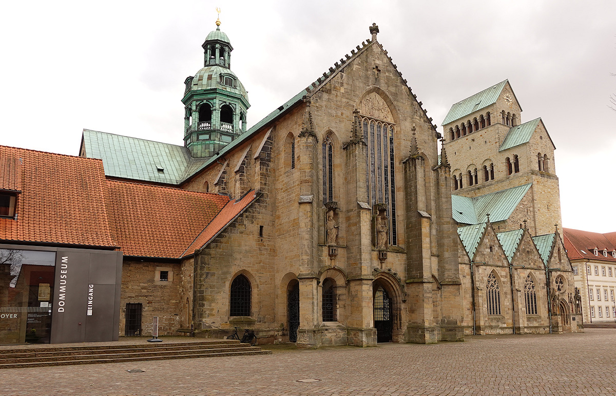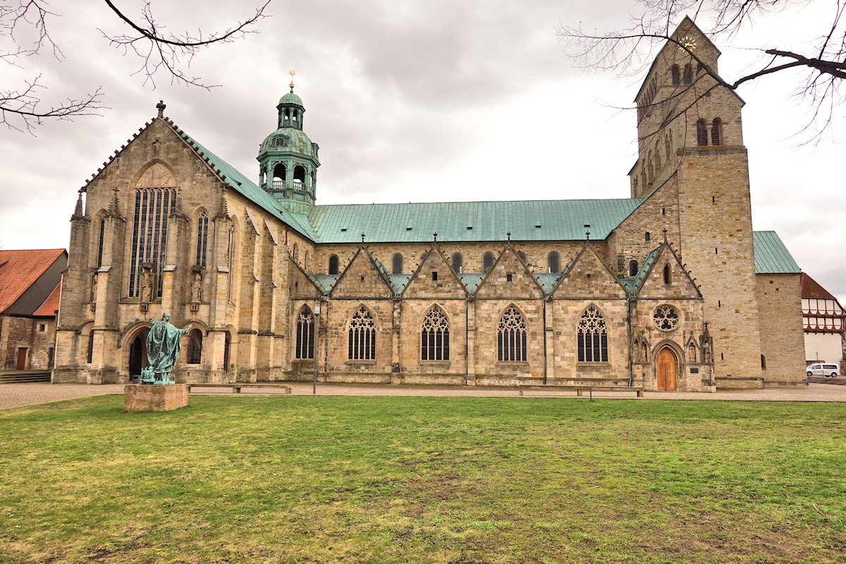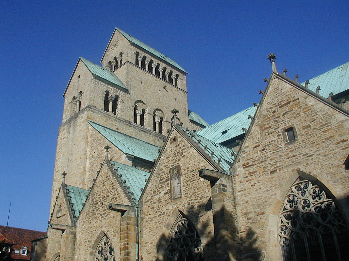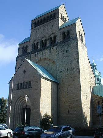 Ein mehrmals umgebauter Vorgängerbau mit Weihedatum 872, der auf Bischof Altfrid zurückgeht, brannte 1046 ab. Bischof Hezilo errichtete auf den Resten einen neuen Dom, der im Jahre 1061 geweiht wurde. Der Dom wurde am 22.3.1945 während des zweiten Weltkrieges fast vollständig zerstört und zwischen 1950 und 1960 wiederaufgebaut. An der Apsis rankt der weltberühmte tausendjährige Rosenstock.