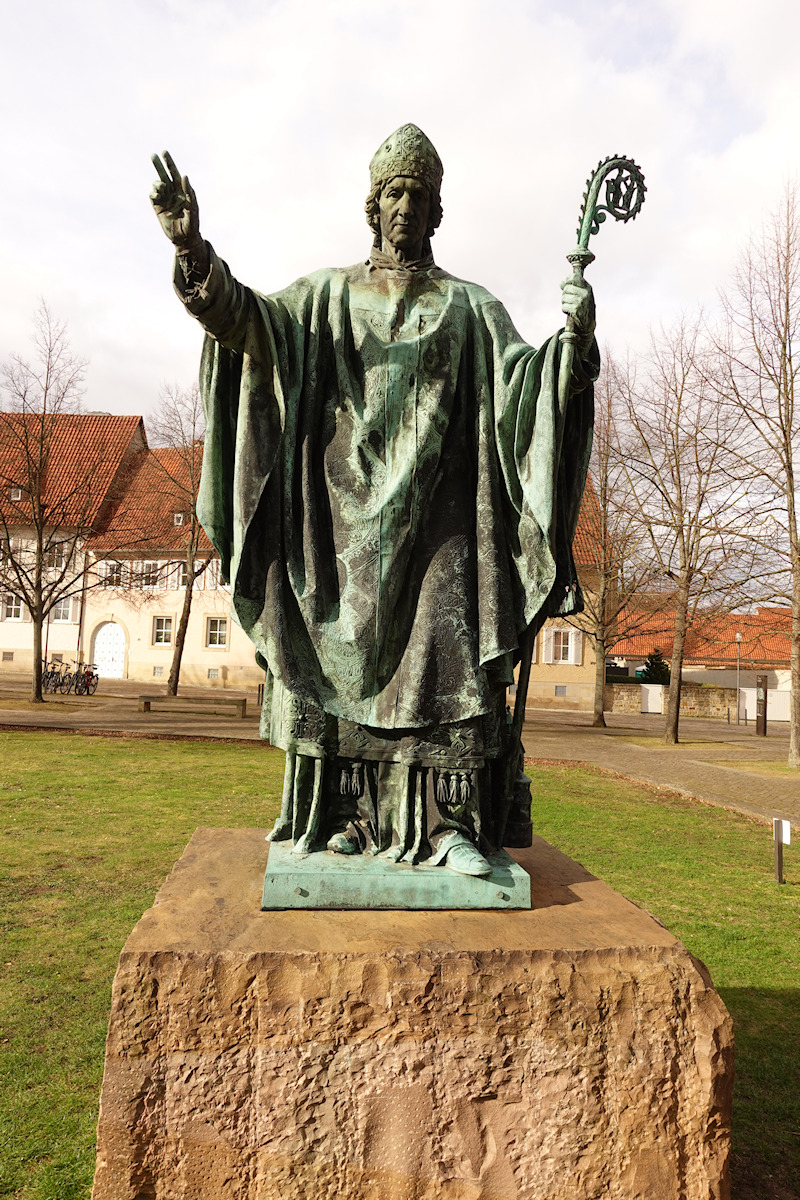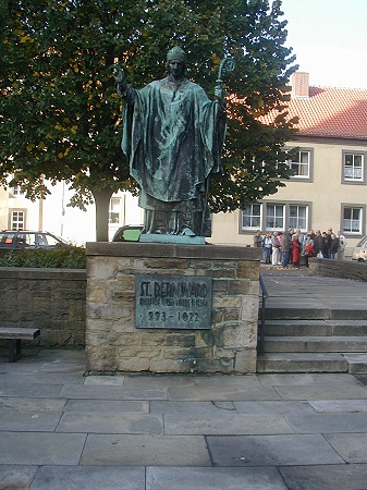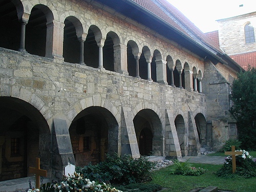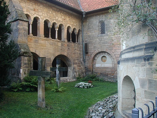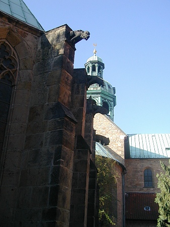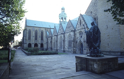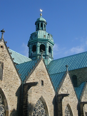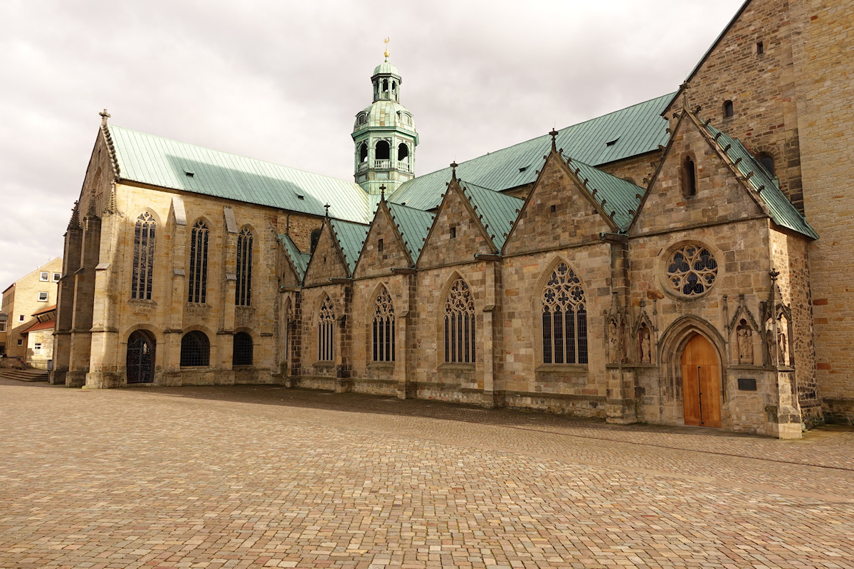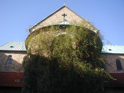 Ein mehrmals umgebauter Vorgängerbau mit Weihedatum 872, der auf Bischof Altfrid zurückgeht, brannte 1046 ab. Bischof Hezilo errichtete auf den Resten einen neuen Dom, der im Jahre 1061 geweiht wurde. Der Dom wurde am 22.3.1945 während des zweiten Weltkrieges fast vollständig zerstört und zwischen 1950 und 1960 wiederaufgebaut. An der Apsis rankt der weltberühmte tausendjährige Rosenstock.