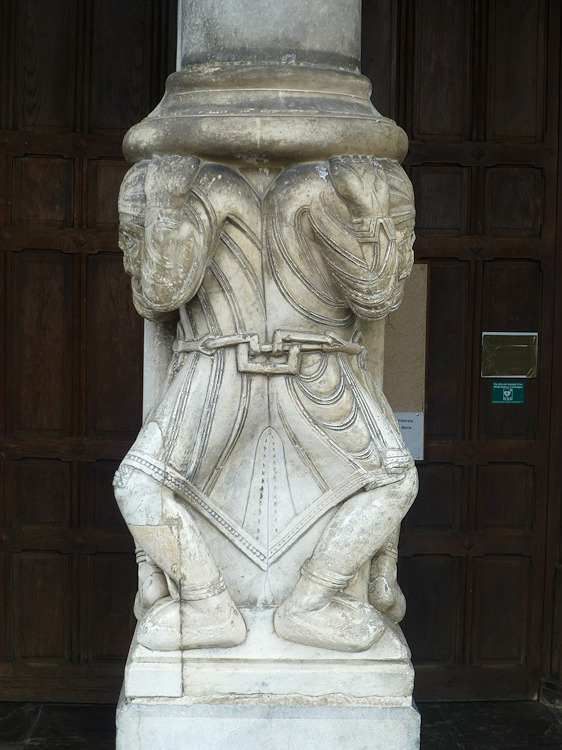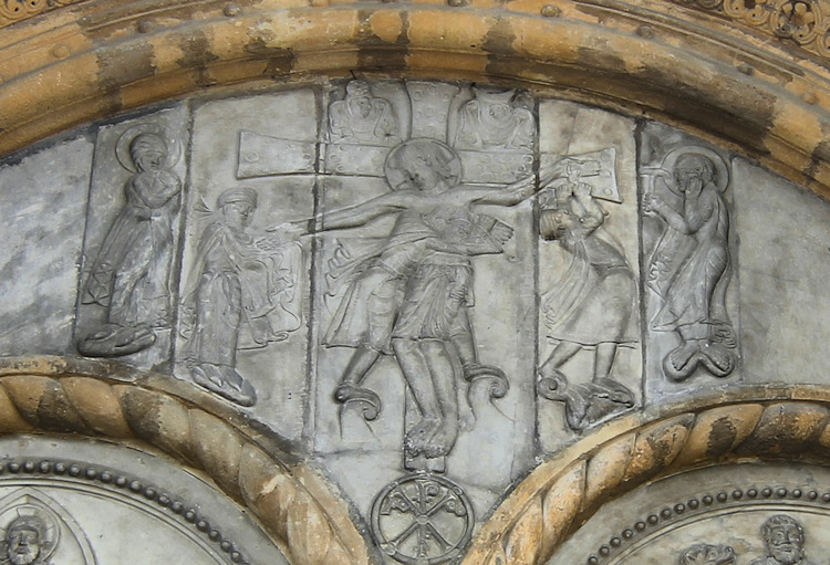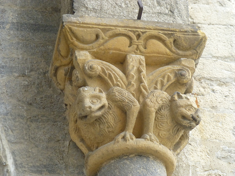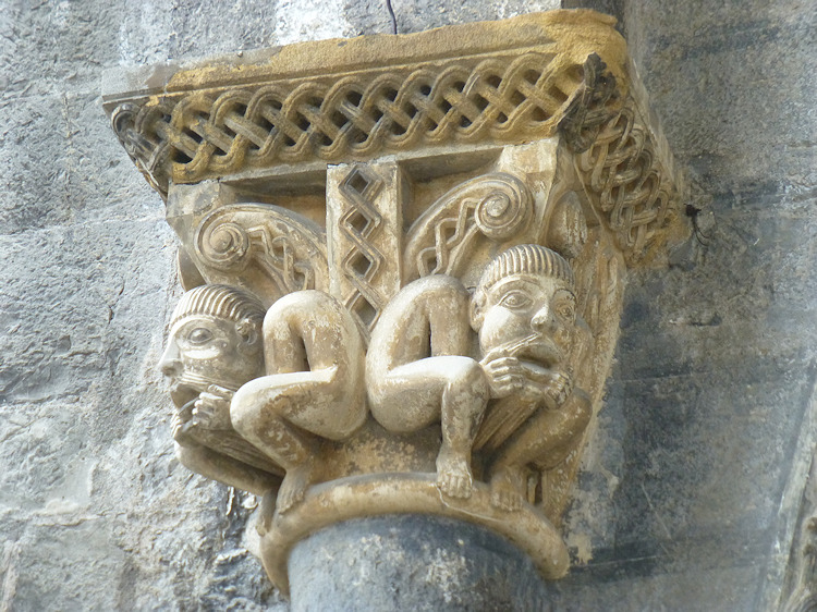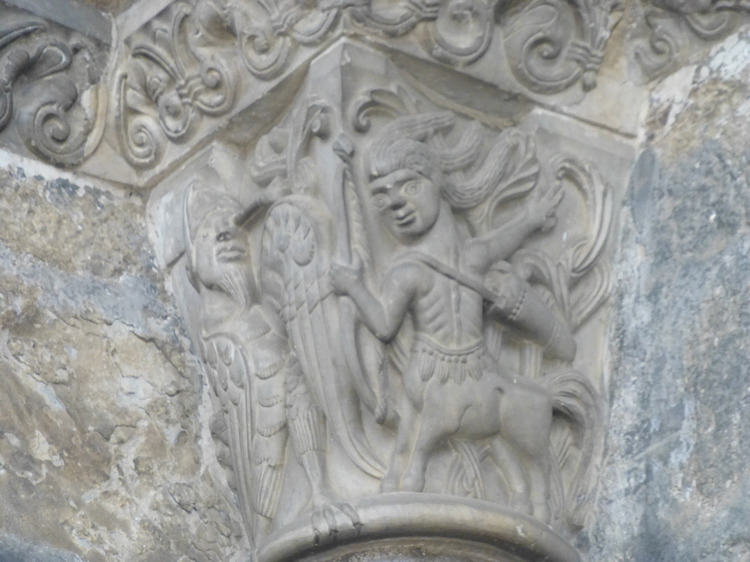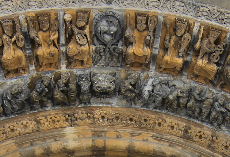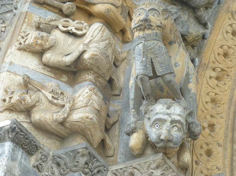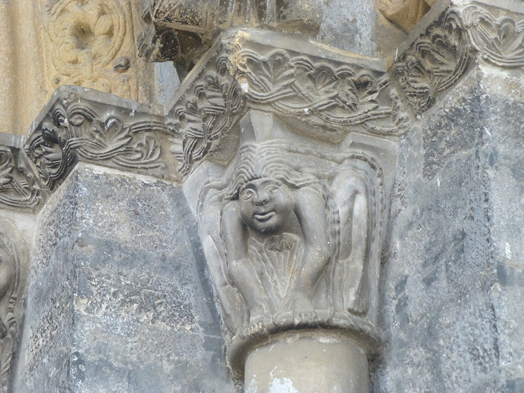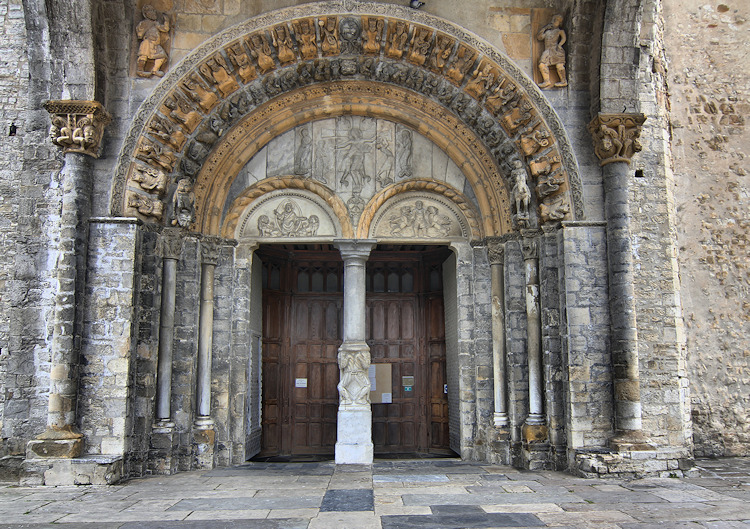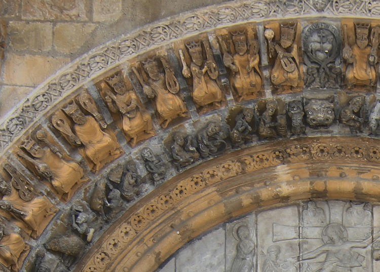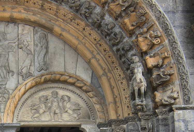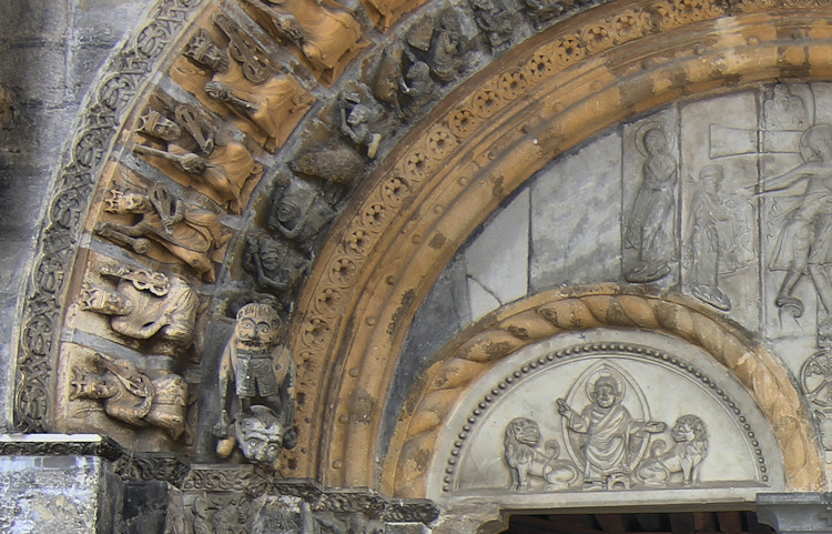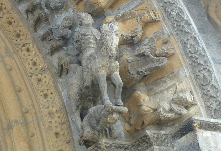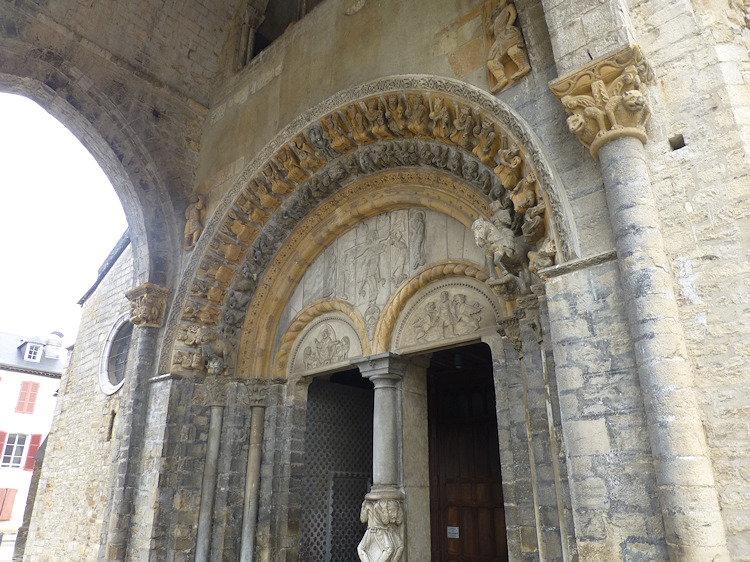 Ein wunderbares romanisches Westportal befindet sich an der Kirche Sainte-Marie in Oloron-Sainte-Marie. Die Kirche aus dem 12. Jh wurde zerstört und mehrmals umgebaut, doch das Portal, das vom Vorbau des Glockenturms geschützt ist, ist noch original erhalten. Es zeigt eine seltene Darstellung einer Kreuzabnahme im Portal-Tympanon. Im Bogenfeld darüber sind die vierundzwanzig Könige der Apokalypse dargestellt. Der Trumeau wird von zwei angeketteten Männern getragen die auf Befreiung warten (Abb.5). Folgt man dem Mittelpfeiler hoch in die Bogenmitte des Portals kann man das Lamm und Kreuz als Christussymol über dem Höllenrachen erkennen. Am Anfang des zweiten Bogenfelds links ist das Thema des menschenfressenden Teufels zu sehen (Abb.21), am rechten Ende der Reiter, der einen Ketzer zertrampelt (Abb.22).