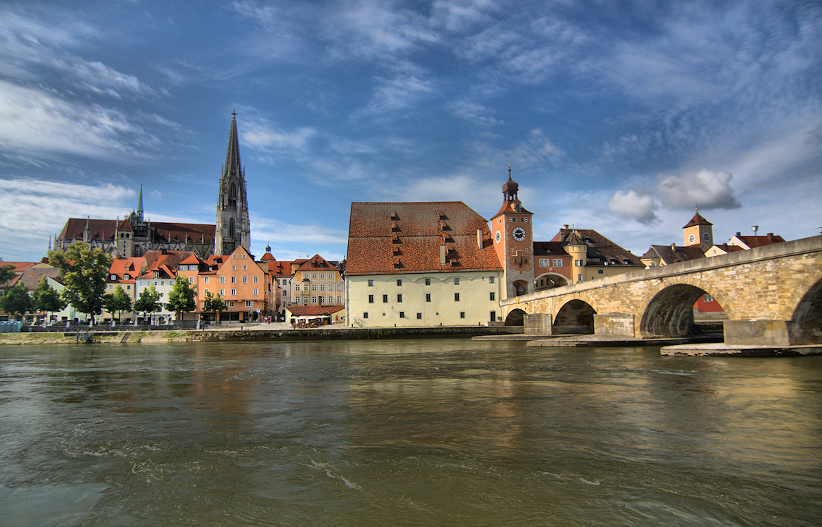 Majestätisch dominiert der Dom die Altstadtsilhouette von Regensburg. Der Baubeginn für den Dom St. Peter war im Jahre 1260. In einer etwas anderen Lage befand sich zuvor ein karolingischer Dom mit ottonischen Anbauten. Aufgrund der Unterstützung von König Ludwig I. erfolgte ab 1859 der Ausbau der jetzt 105 m hohen Türme. Der Dom ist der wichtigste gotische Bau in Bayern.