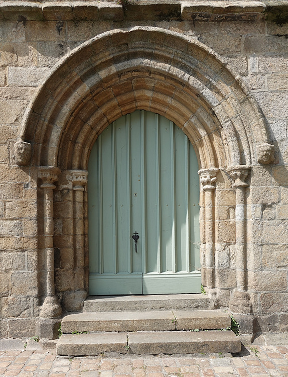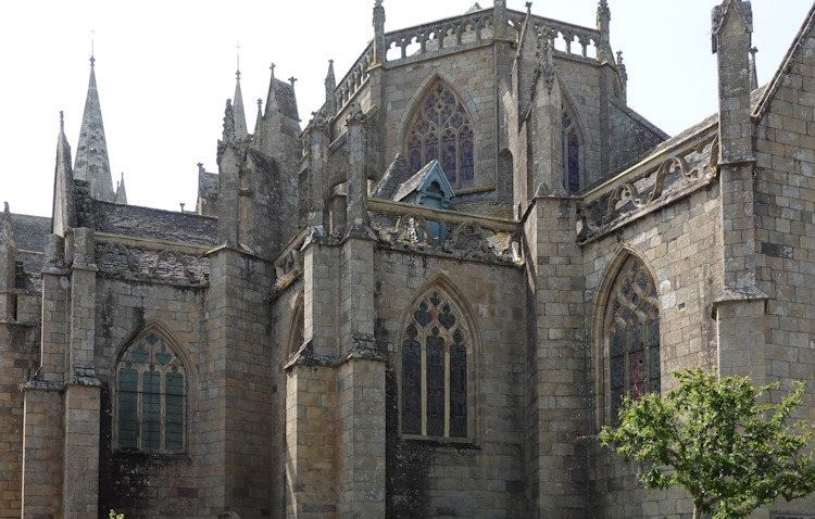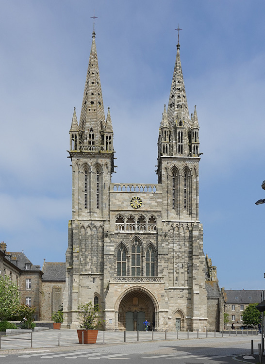 Die ehemalige Kathedrale Saint-Paul-Aurélien in Saint-Pol-de-Léon wurde ab 1230 an der Stelle eines romanischen Vorgängerbaus errichtet. Der Fassade weist Ähnlichkeiten mit großen normannischen Kathedralen, etwa wie die von Lisieux oder Coutances auf. |