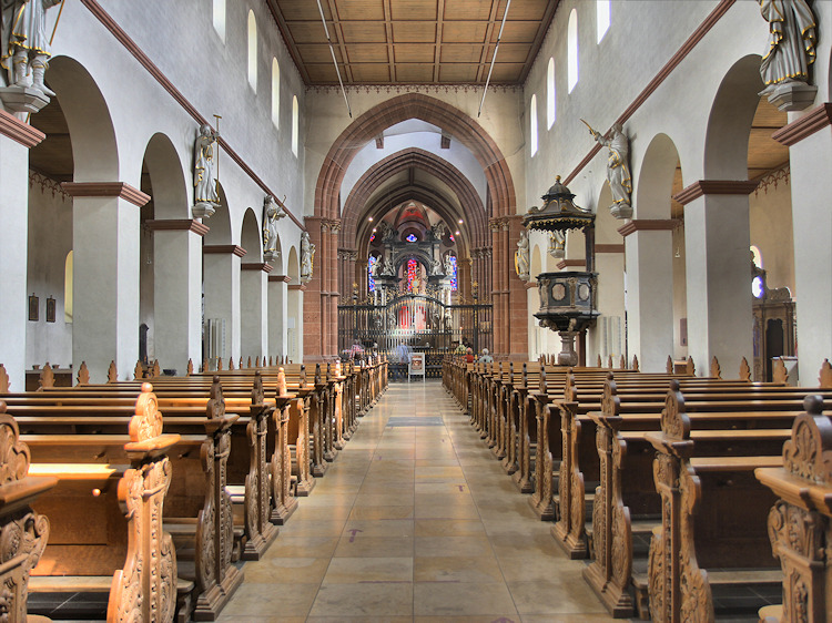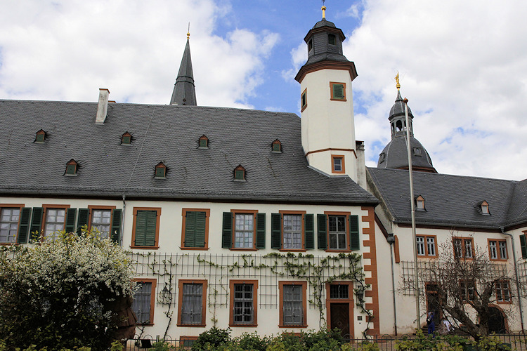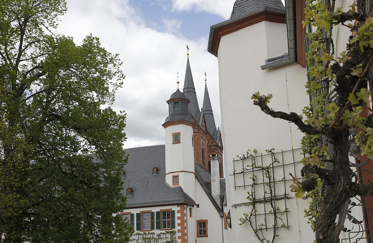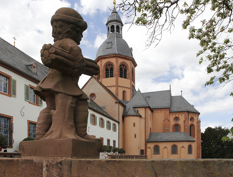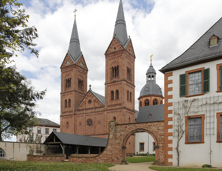 Im Jahre 815 gründete Einhard, ein Vertrauter von Karl dem Großen, hier eine Benediktinerabtei. Im Jahre 828 überführte er die zuvor in der Einhardsbasilika in Steinbach aufbewahrten Reliquien der Heiligen Marcellinus und Petrus Martyr nach Seligenstadt, das zu dieser Zeit noch Mulinheim hies. Nachdem der Ort ein Wallfahrtsort wurde begann Einhard um 830 mit dem Bau der ursprünglich dreischiffigen Pfeilerbasilika. In den folgenden Jahrhunderten wurde mehrfach umgebaut, vor allem nach den Zerstörungen des Dreißigjährigen Krieges. Die Westfassade präsentiert sich heute im neoromanischen Stil des 19. Jh., während etwa der Vierungsturm noch mit frühgotischen Maßwerkfenstern ausgestattet ist. Von dem ursprünglichen Zustand der Basilika ist zwar nicht mehr viel zu sehen, aber die gesamte Klosteranlage mit ihren Bauwerken, Gärten und Mauern ist sehr harmonisch und schön. Dagegen gilt die Steinbacher Einhardsbasilika als eines der wenigen noch teilweise erhaltenen Beispiele karolingischer Baukunst in Deutschland. |