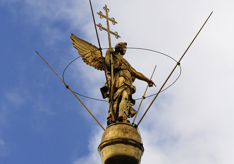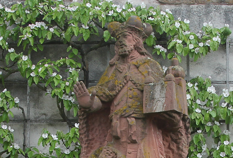 | Klostergründer Einhard auf einer Barockstatue im Konventgarten |